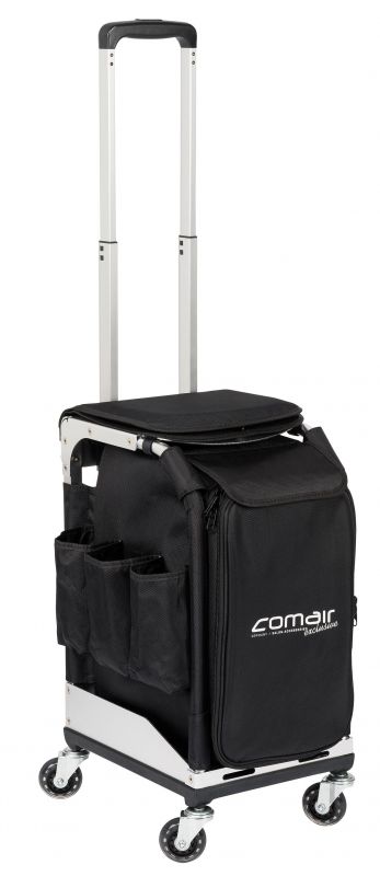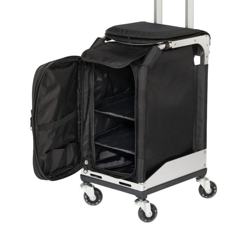 Multifunktionaler Sitz-Werkzeugkoffer, ausziehbarer, in 3 Höhen verstellbarer Teleskopgriff, praktischer Tragegriff, 4 gummierte Laufrollen für bequeme Handhabung, komfortabel gepolsterte Sitzfläche, Gestell aus Aluminium und mit robustem Stoff überzogen, geräumige und abnehmbare Ablagefächer sowie diverse praktische Stecktaschen.